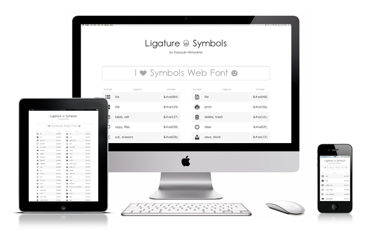 7. Ligature Symbols http://kudakurage.com/ligature_symbols/ Grande variedade de ícones de fonte com qualidade permitindo criar sites responsivos, possui suporte para multi plataforma.